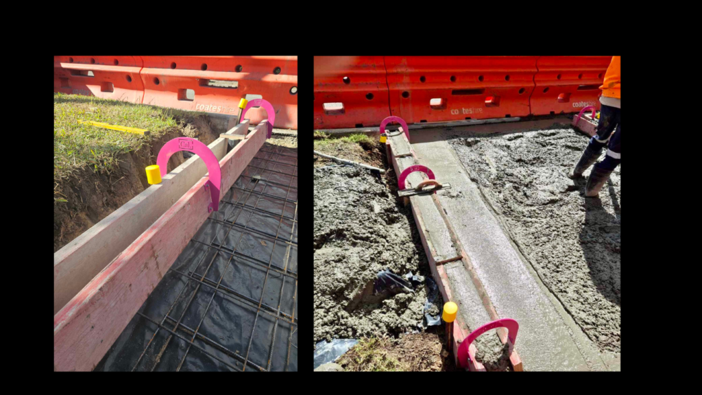 The Cal. Bracket when secured, strongly maintains your formwork in place, without movement to form a barrier kerb, without the need to use pegs or attach anything to the underlying ground –streamlining the formwork setup.